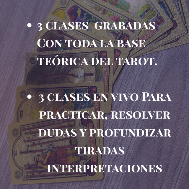 Vas a tener 3 clases grabadas con la base teórica del tarot, y 3 clases en vivo para practicar, hacer preguntas y profundizar. También vamos a ver otras formas de interpretar y distintas tiradas.