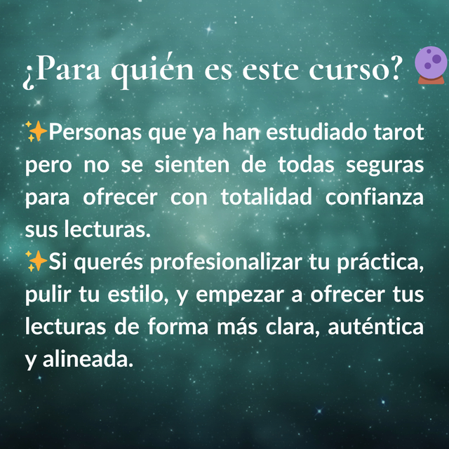 Con este curso vas a sentirte más seguro/a, preciso/a y profesional a la hora de leer el tarot. Vas a profundizar tu práctica, fortalecer tu intuición y tener las herramientas para ofrecer tus lecturas con seguridad, confianza y claridad.